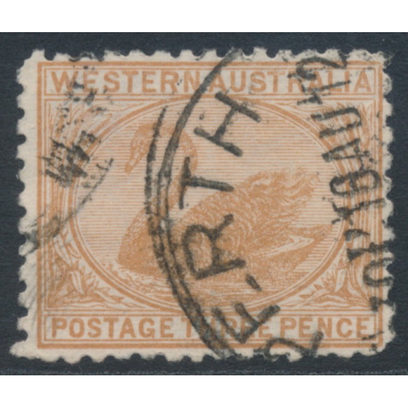 1906 3d yellow-brown Swan, perf. 12½:12, reversed & inverted sideways crown double-lined A watermark (the crown points right as seen from the back of the stamp), used – no thins, tears or bends. The ACSC catalogue doesn’t list this watermark variant.