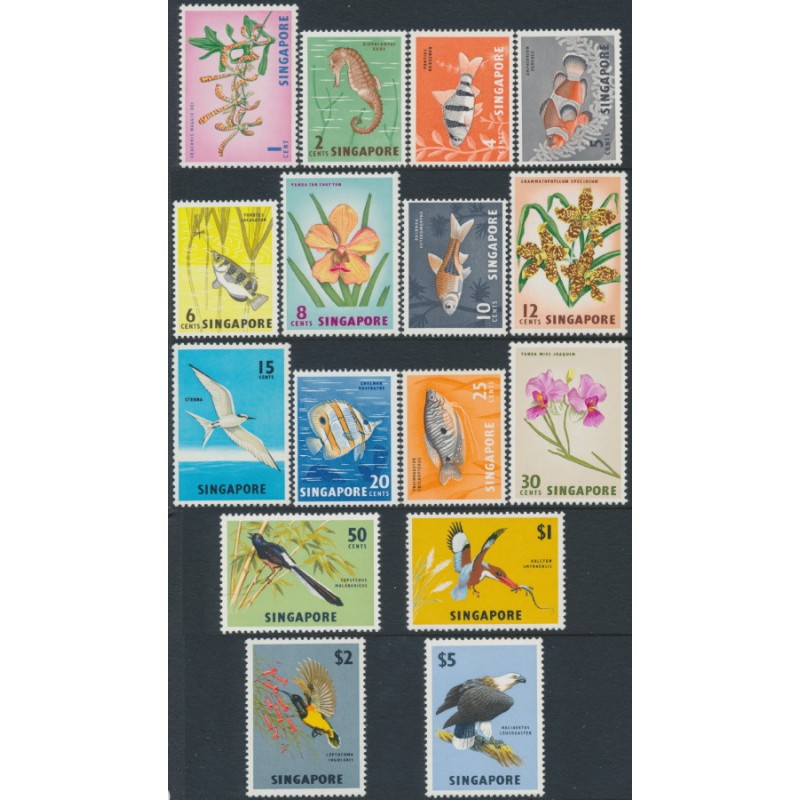 SINGAPORE 1962-1967 1c to $5 Flowers, Birds & Fish definitive set of 16, mint never hinged – no thins, tears or bends. SG Cat. # 63-77