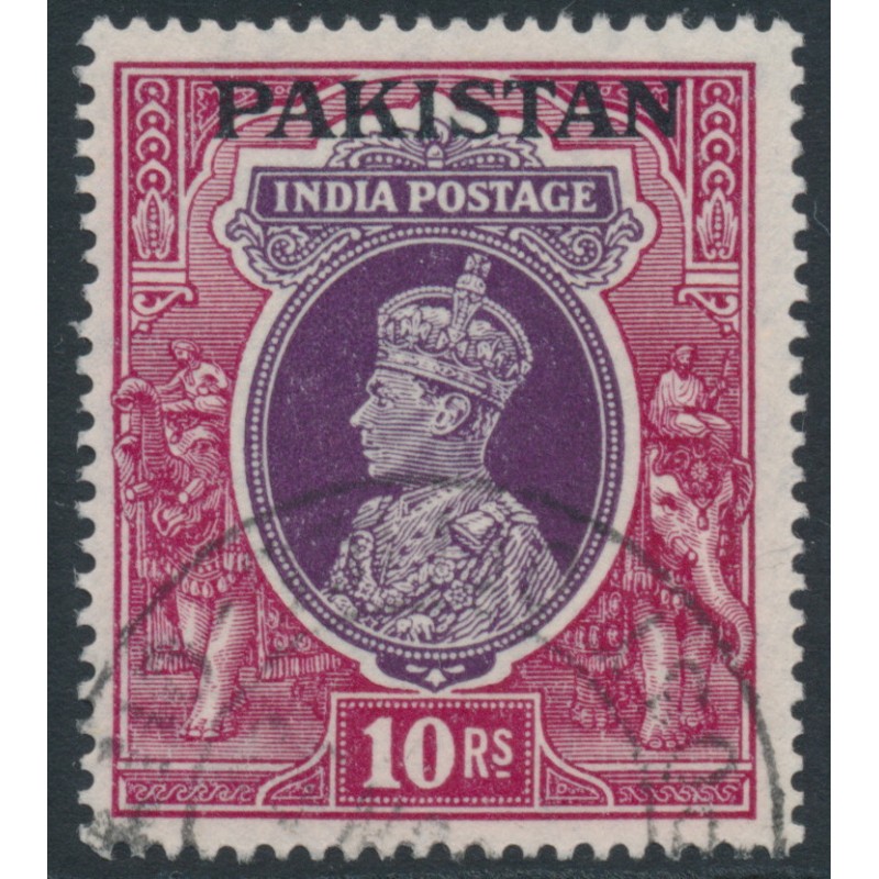 PAKISTAN 1947 10R purple/claret Indian KGVI definitive, overprinted PAKISTAN, used – no thins, tears or bends. SG Cat. # 17