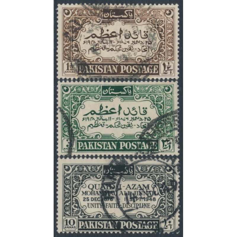 PAKISTAN 1949 1½a to 10a Mohammed Ali Jinnah set of 3, used – no thins, tears or bends. SG Cat. # 52-54