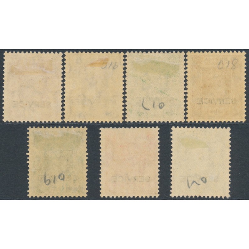 BURMA 1939 3p to 4a King George VI portrait definitives set of 7, overprinted SERVICE, mint hinged – no thins, tears or bends. SG Cat. # O15-O20 + O22