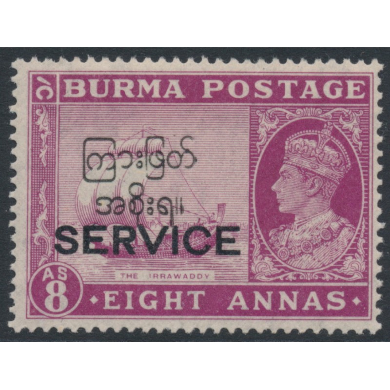 BURMA 1947 8a maroon Irrawaddy River, overprinted SERVICE and Burmese Interim Government, mint hinged – no thins, tears or bends. SG Cat. # O49