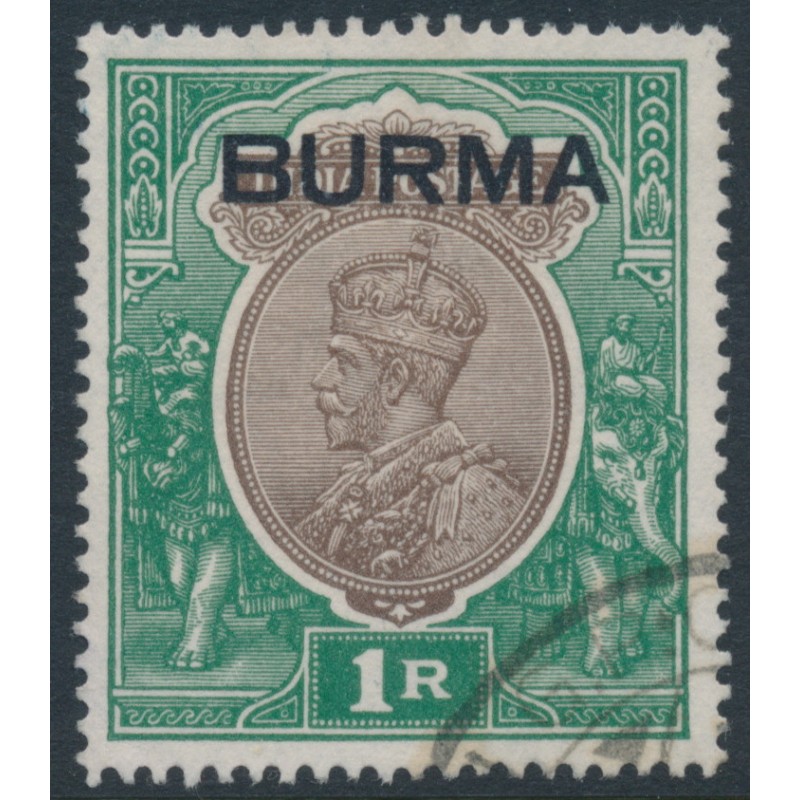 BURMA 1937 1Rp chocolate/green Indian King George V definitive overprinted BURMA, used – no thins, tears or bends. SG Cat. # 13
