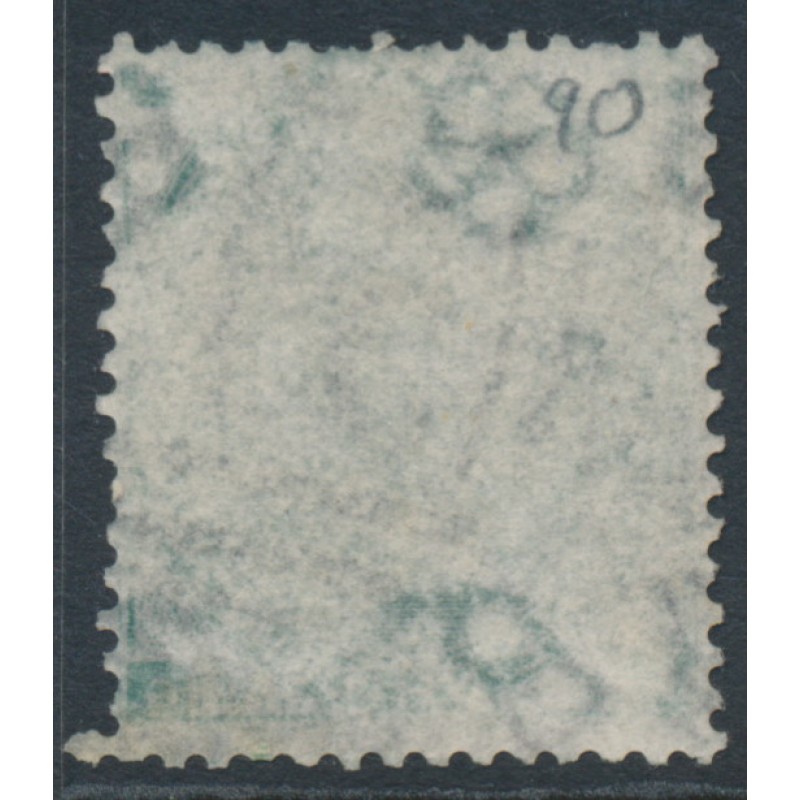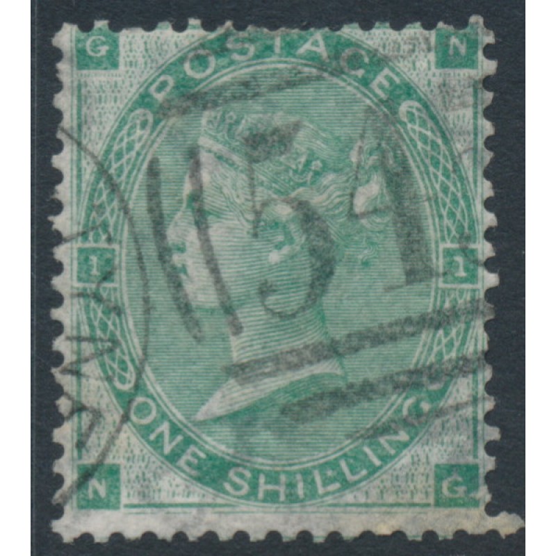 GREAT BRITAIN / UNITED KINGDOM / ENGLAND / G.B. / U.K. 1862 1/- green Queen Victoria, Emblems watermark, plate 1, check letters NG, used – no thins, tears or bends. SG Cat. # 90