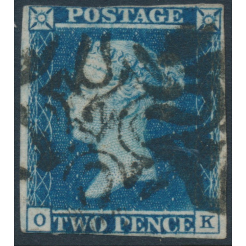 1841 2d deep blue Queen Victoria, imperforate, plate 3, check letters OK, used – has a ‘12’ Maltese Cross cancel, no thins, tears or bends.