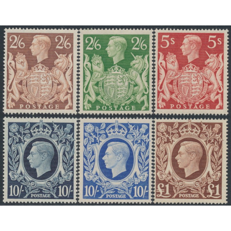 1939-1942 2/6 to £1 King George VI definitives set of 6, mint hinged – no thins, tears or bends.