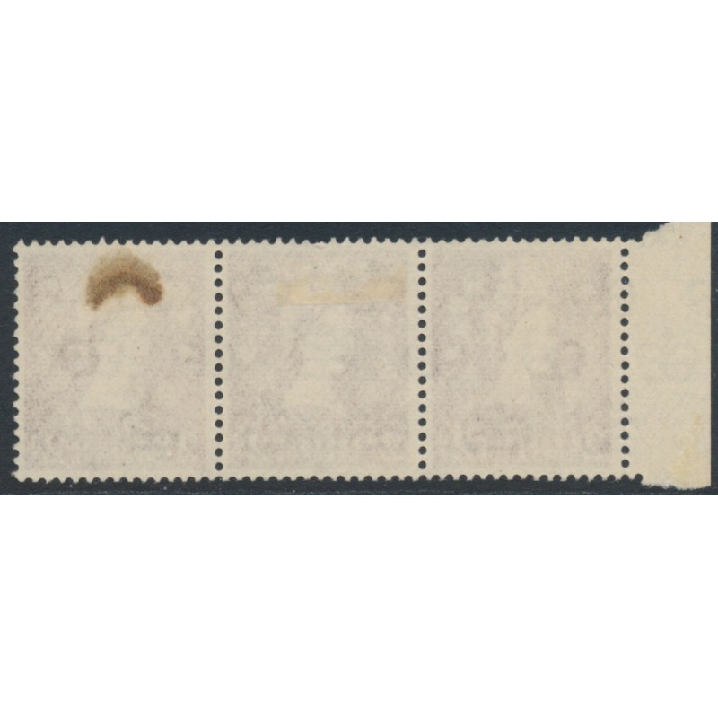 1958 2d red-brown Queen Elizabeth II definitive, multi crown watermark (= SG type W179), horizontal strip of three, the right stamp has a big ink blob, mint never hinged – the central stamp is hinged, the stamp with the variety is MNH, no thins, tears or bends.