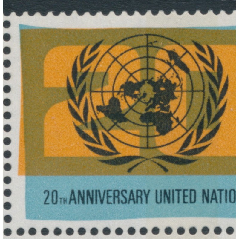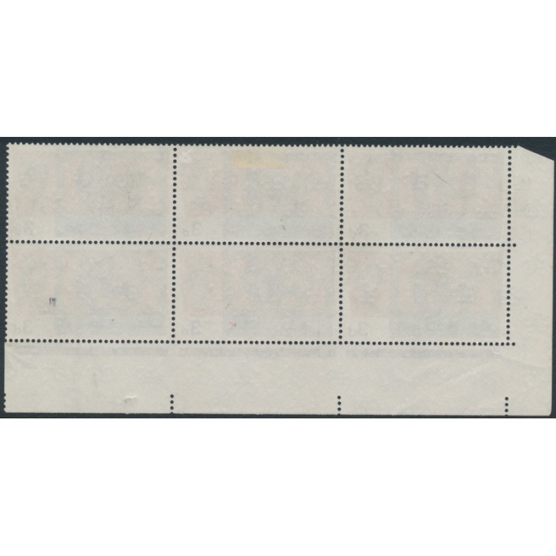 1965 3d United Nations Anniversary, block of 6, no phosphor lines, the upper right stamp has the variety ‘lake in Russia’, mint never hinged – the central stamp in the top row is hinged, the variety is MNH, no thins, tears or bends.