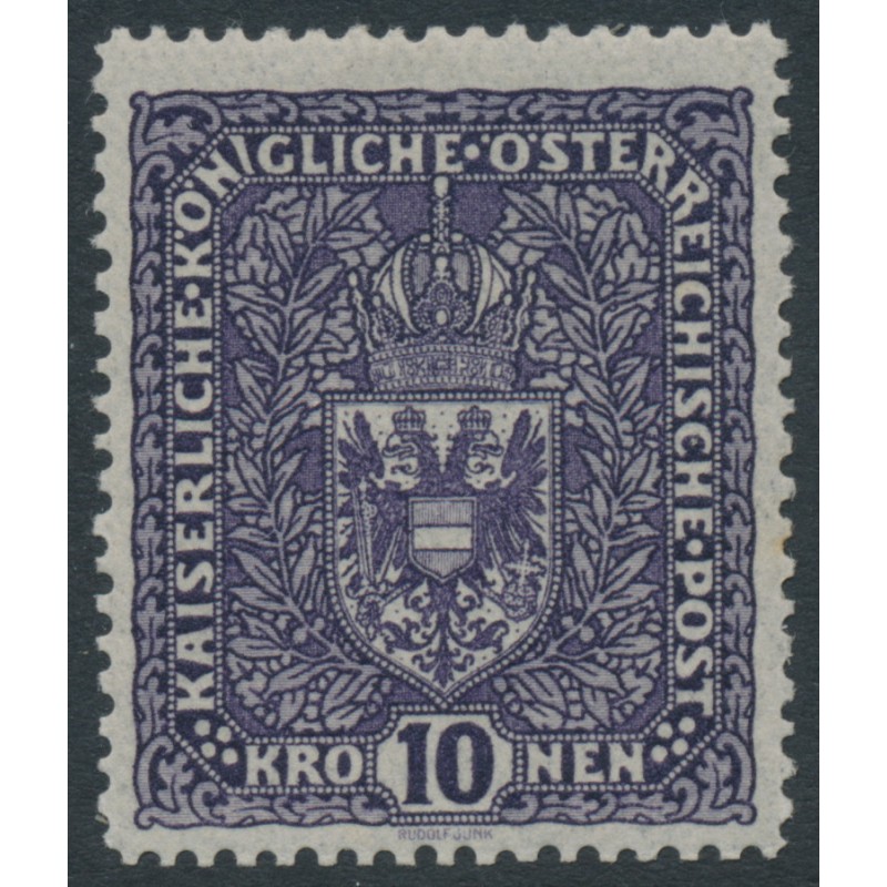 AUSTRIA / ÖSTERREICH 1917 10Kr deep violet Coat of Arms, plain paper, perf. 12½:12½, picture size = 25mm x 30mm, mint hinged – no thins, tears or bends. Michel Cat. # 207I