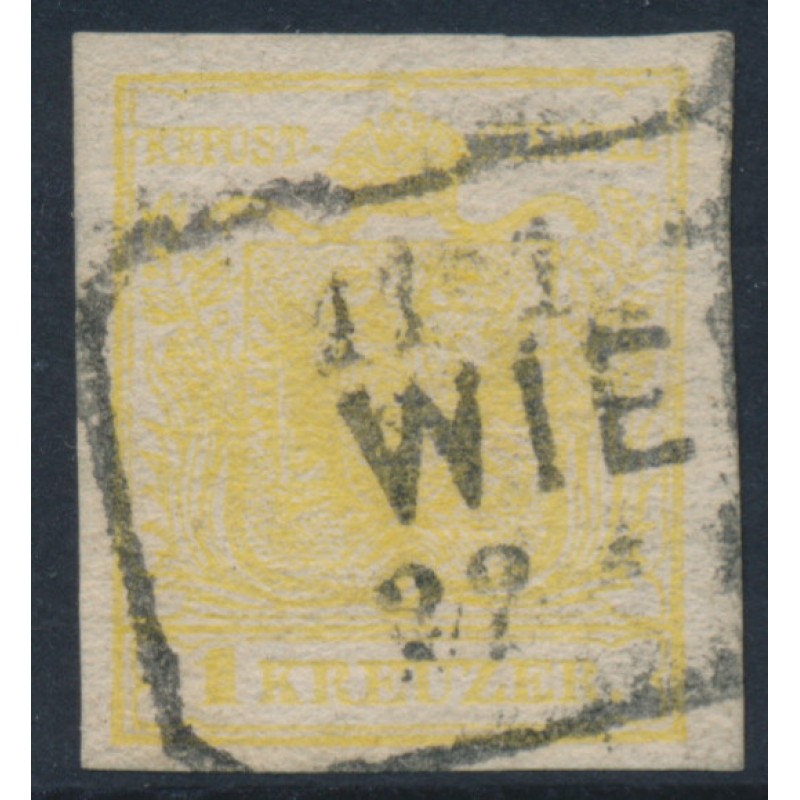 1854 1Kr lemon-yellow Coat of Arms, type III, imperforate on machine-made paper, used – no thins, tears or bends. Has a Goller BPP photo-certificate which states that the stamp is genuine and fault-free.