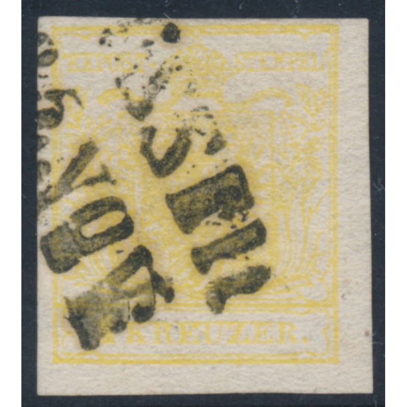 1854 1Kr lemon-yellow Coat of Arms, type III, imperforate on machine-made paper, used – no thins, tears or bends. Has a Goller BPP photo-certificate which states that the stamp is genuine and fault-free.