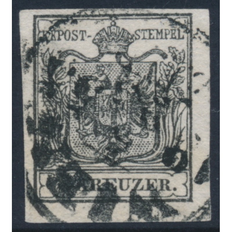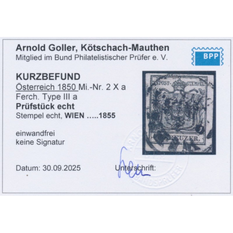1850 2Kr black Coat of Arms, type IIIa, imperforate on hand-made paper, used – no thins, tears or bends. Has a Goller BPP photo-certificate which states that the stamp is genuine and fault-free.