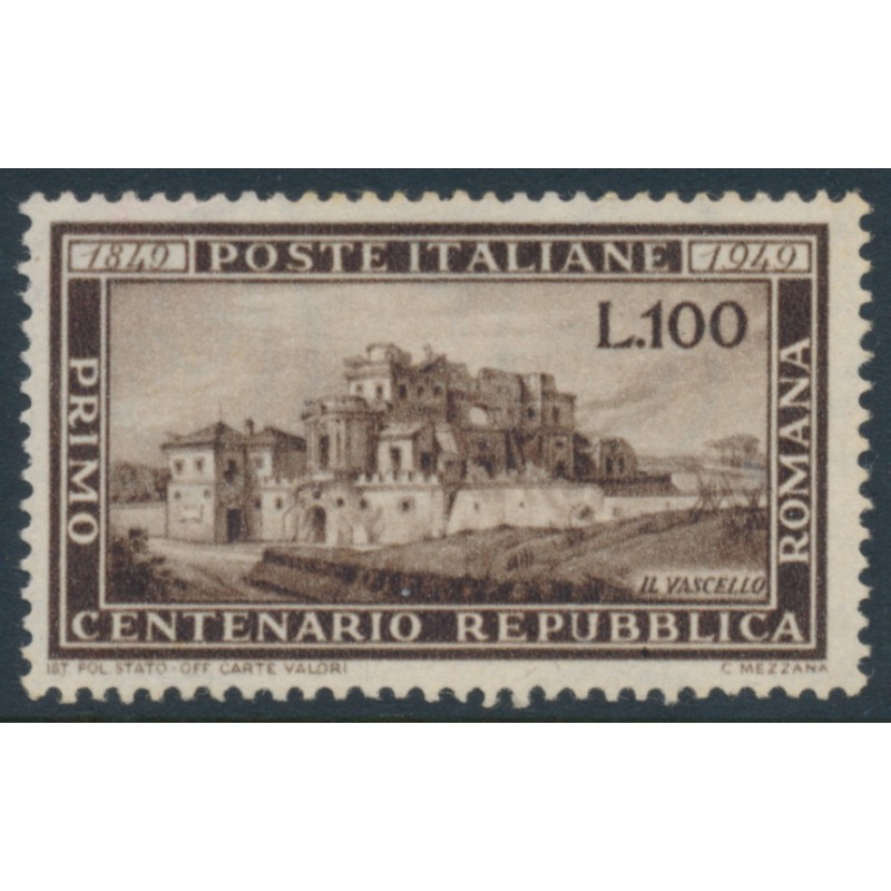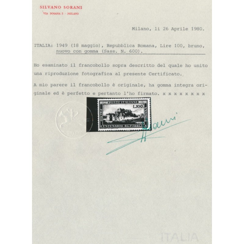 ITALY / ITALIA 1949 100L dark brown Anniversary of La Repubblica Romana, mint never hinged – no thins, tears or bends. Has a Sorani photo-certificate. Michel Cat. # 773 SG Cat. # 726