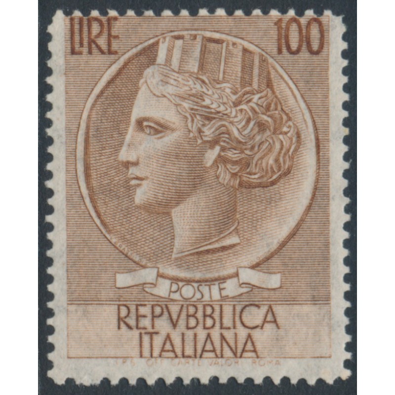 1955 100L brown Italia Turrita – Siracusana (Syracuse), perf. 13¼:14, stars watermark, mint never hinged – no thins, tears or bends. Has a Della Casa photo-certificate.