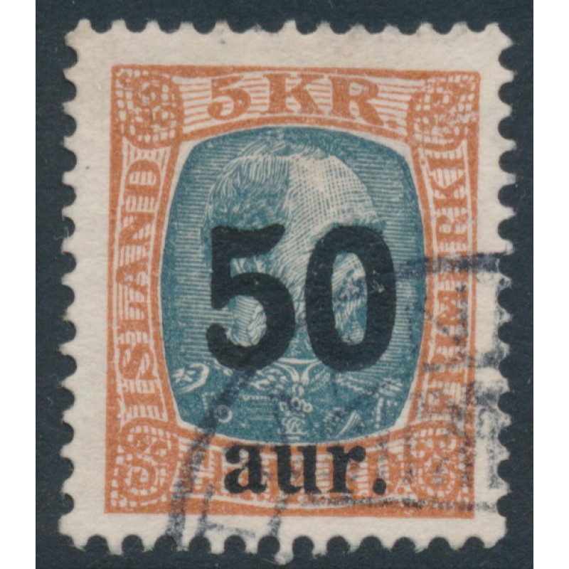 1925 50aur overprint on 5Kr red-brown/grey King Christian IX, used – no thins, tears or bends.