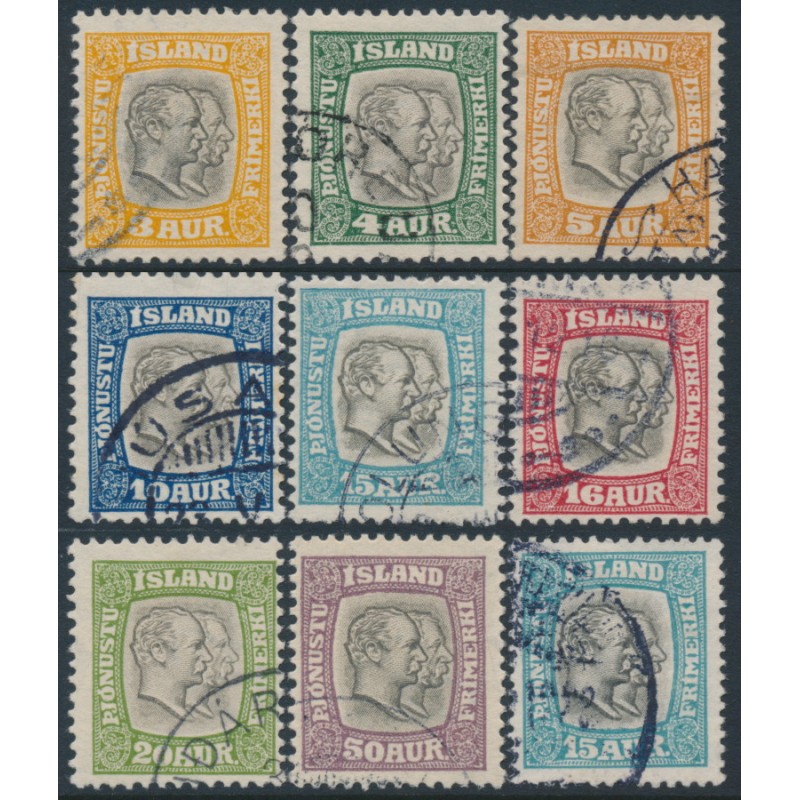 1907-1918 3a to 50a Two Kings ÞJÓNUSTU (Officials) set of 9, used – no thins, tears or bends.