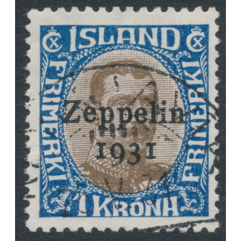 ICELAND / ÍSLAND 1931 1Kr blue/brown King Christian X, overprinted Zeppelin 1931, used – no thins, tears or bends. Michel Cat. # 148 Facit Cat. # 163