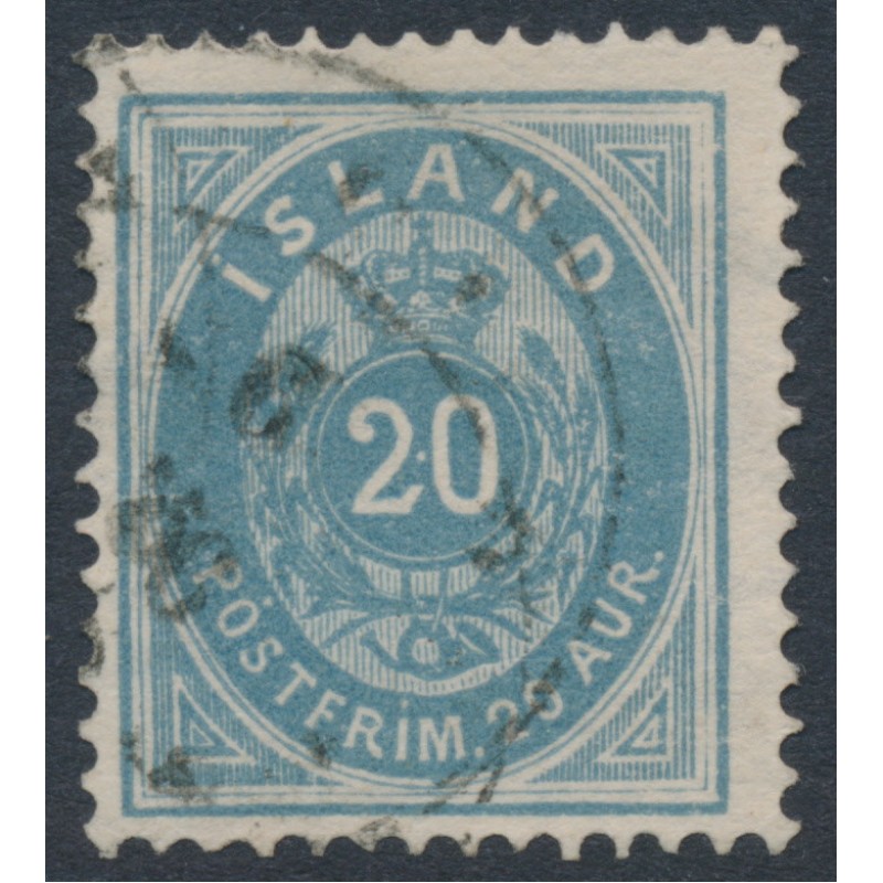 ICELAND / ÍSLAND 1885 20aur grey-blue Numeral, perf. 14:13½, used – no thins, tears or bends. Michel Cat. # 14Aa Facit Cat. # 15b