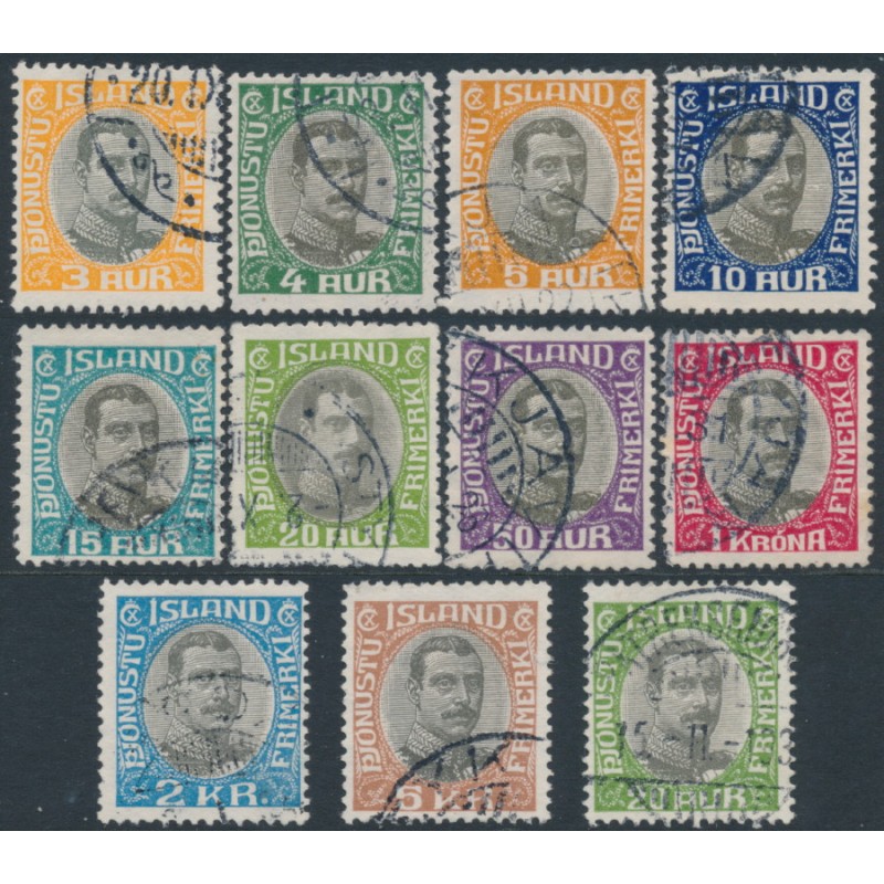 ICELAND - 1920 3a to 1Kr King Christian X ÞJÓNUSTU (Officials) set of 11, used – Facit # TJ42-TJ52