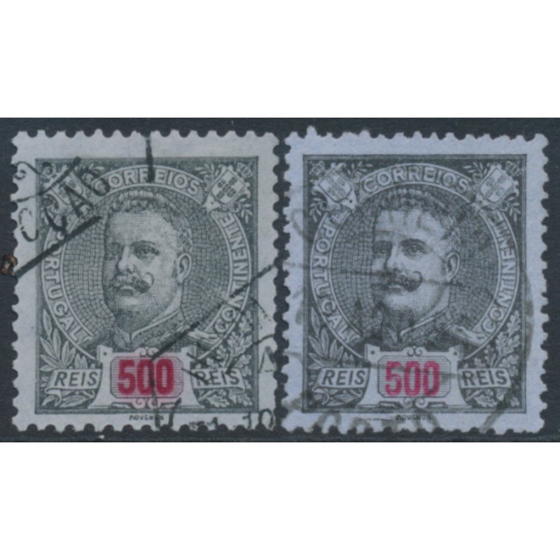 PORTUGAL 1896 500R black/red on pale blue King Carlos I, perf. 11½:11½ & 12½:12½, used – no thins, tears or bends. Michel Cat. # 137A + 137B