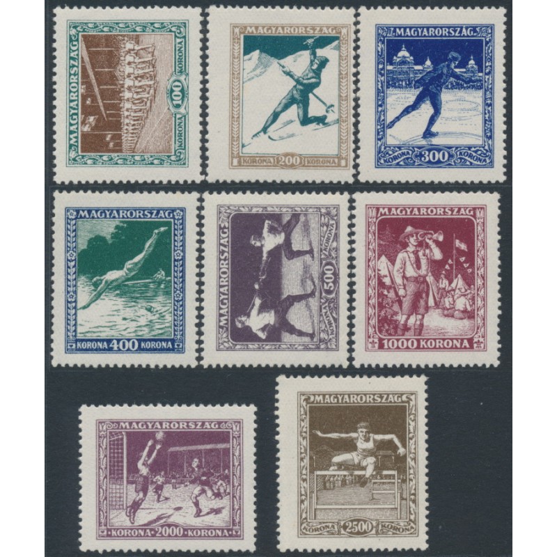 HUNGARY / MAGYARORSZÁG / MAGYAR KÖZTÁRSASÁG 1925 Sports & Boy Scouts set of 8, mint never hinged – no thins, tears or bends. Michel Cat. # 403-410