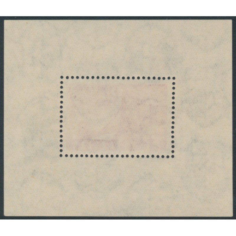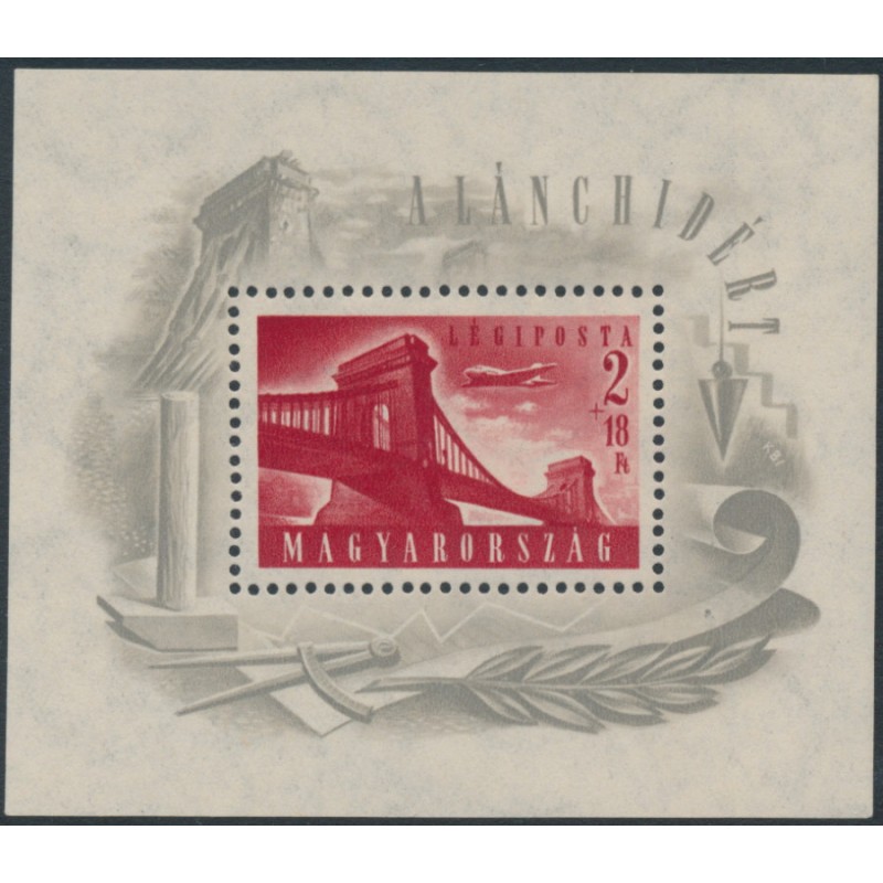 HUNGARY / MAGYARORSZÁG / MAGYAR KÖZTÁRSASÁG 1948 2Ft+18Ft carmine Chain Bridge Reconstruction M/S, mint never hinged – no thins, tears or bends. Michel Cat. # Block 12