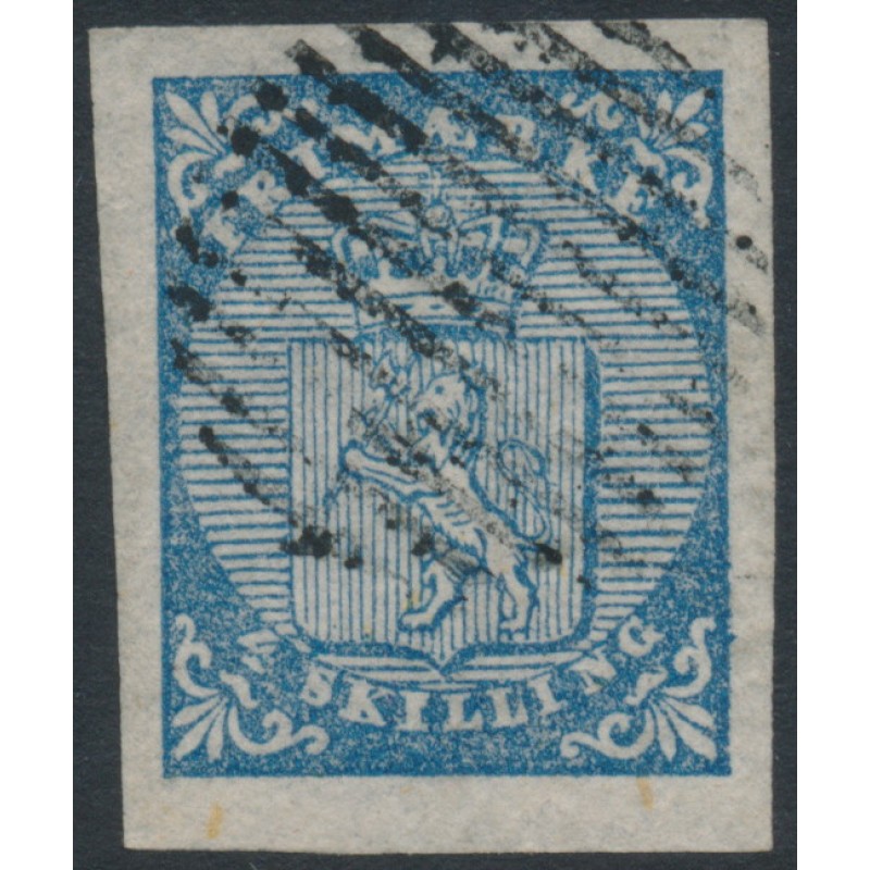 NORWAY / NORGE / NOREG 1855 4 Skilling blue Lion Coat of Arms, imperforate, used – no thins, tears or bends. Facit Cat. # 1 Michel Cat. # 1