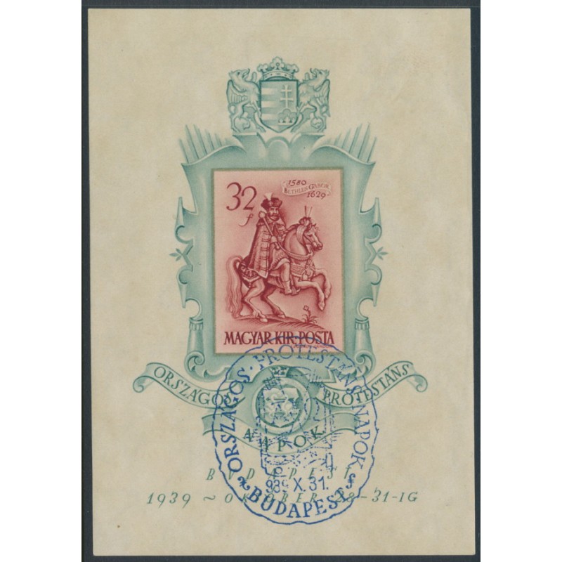 HUNGARY - 1939 32f brown-carmine/gold Bethlen-Gábor M/S (imperf.), used – Michel # Block 6