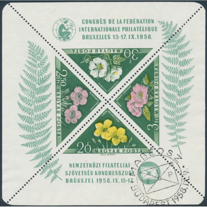 HUNGARY / MAGYARORSZÁG / MAGYAR KÖZTÁRSASÁG 1958 FIP Congress in Brussels M/S, perf. 12, used – no thins, tears or bends. Michel Cat. # Block 28A