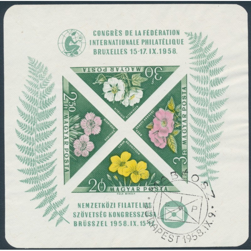 HUNGARY / MAGYARORSZÁG / MAGYAR KÖZTÁRSASÁG 1958 FIP Congress in Brussels M/S, imperforate, used – no thins, tears or bends. Michel Cat. # Block 28B