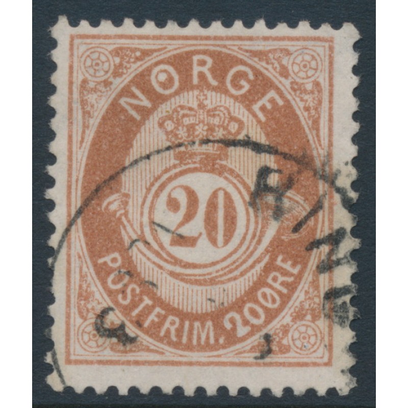 NORWAY - 1882 20øre brown Posthorn (unshaded, picture height = 21mm), 'spot in O', used – Facit # 43