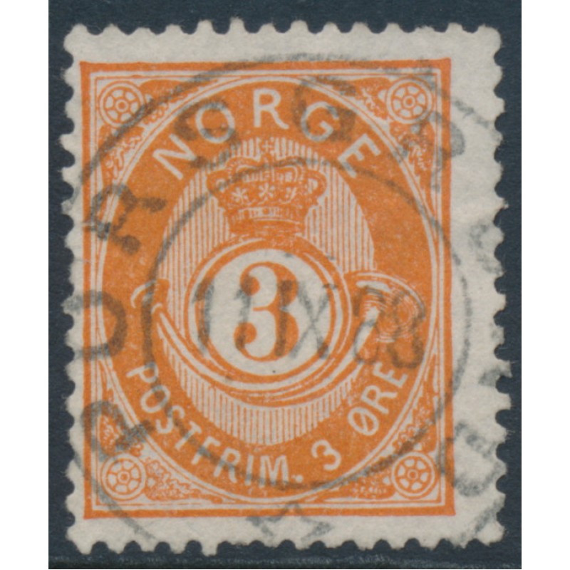 NORWAY - 1886 3øre reddish orange Posthorn (unshaded, picture height = 20mm), used – Facit # 51IIa