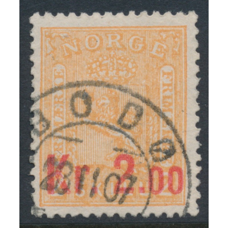 NORWAY / NORGE / NOREG 1905 2.00Kr on 2Sk orange Lion, red overprint, used – BODØ 23 II 1907 cancel, no thins, tears or bends. Facit Cat. # 89a Michel Cat. # 64