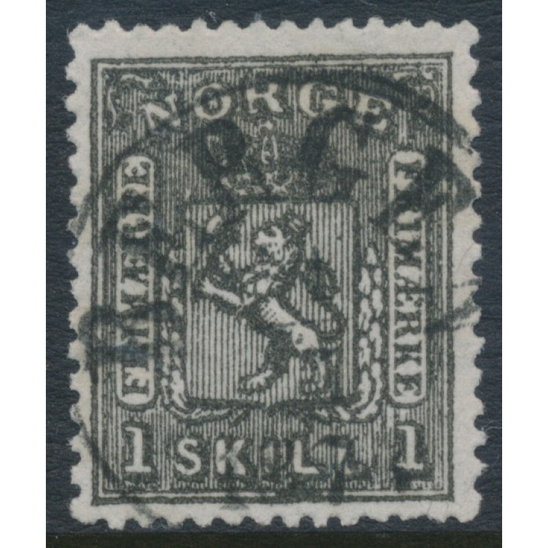 NORWAY / NORGE / NOREG 1868 1Sk black Lion Coat of Arms (blurry print), used – no thins, tears or bends. Has a strong colour. Facit Cat. # 11b Michel Cat. # 11
