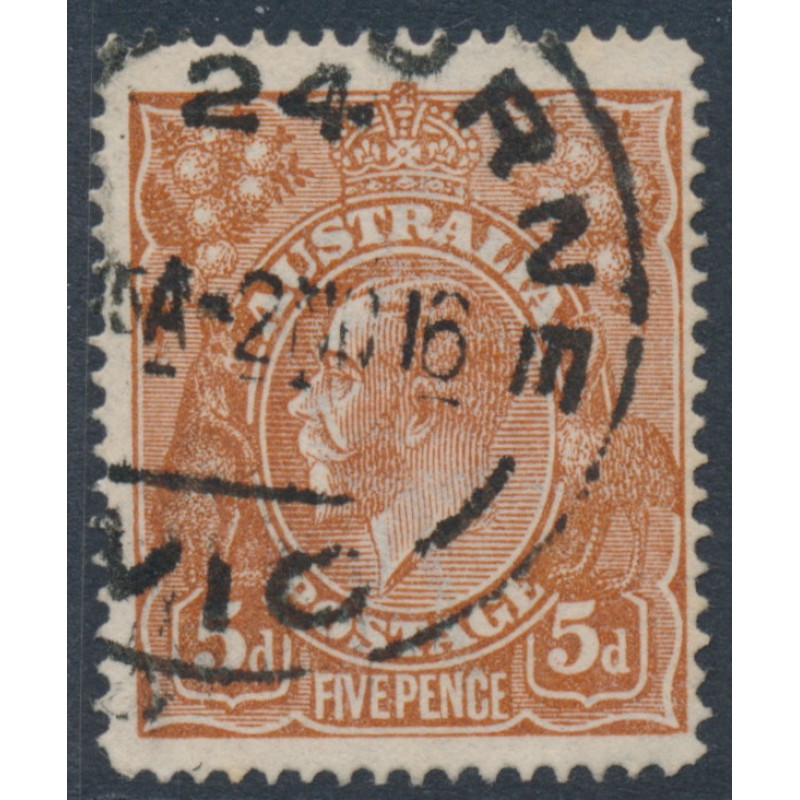 AUSTRALIA 1915 5d chestnut KGV Head, single watermark, line perforated, used – no thins, tears or bends. BW(ACSC) Cat. # 122A SG Cat. # 23