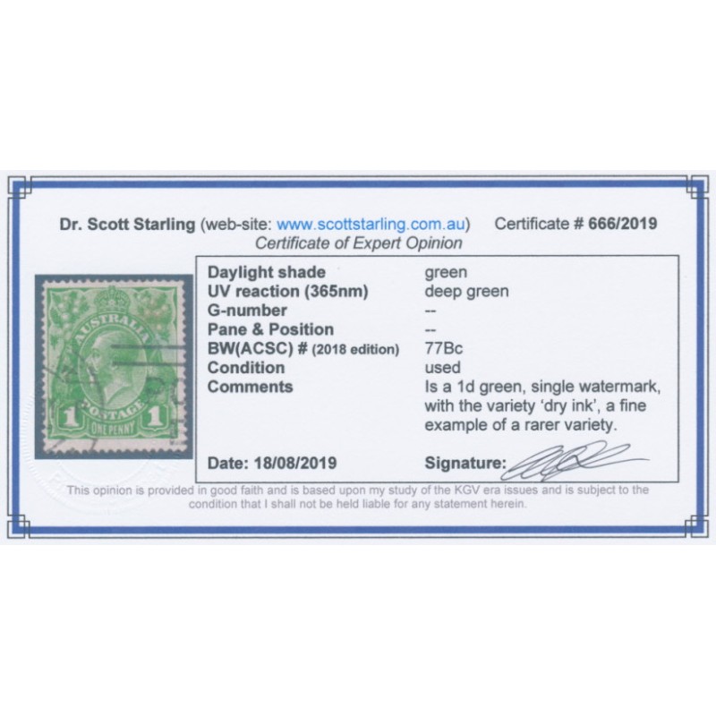 1924 1d green KGV Head, single watermark, with the variety ‘dry ink’, used – no thins, tears or bends. Has a Starling certificate.