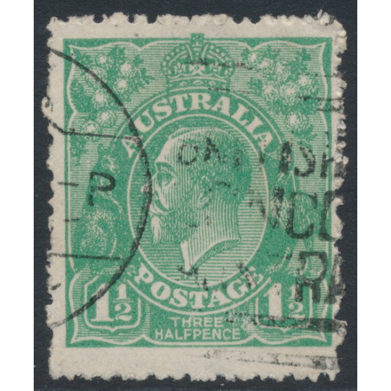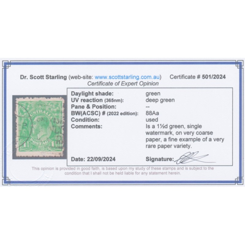AUSTRALIA 1923 1½d green KGV Head, single watermark, on very coarse mesh paper, used – no thins, tears or bends. Has a Starling certificate. BW(ACSC) Cat. # 88Aa