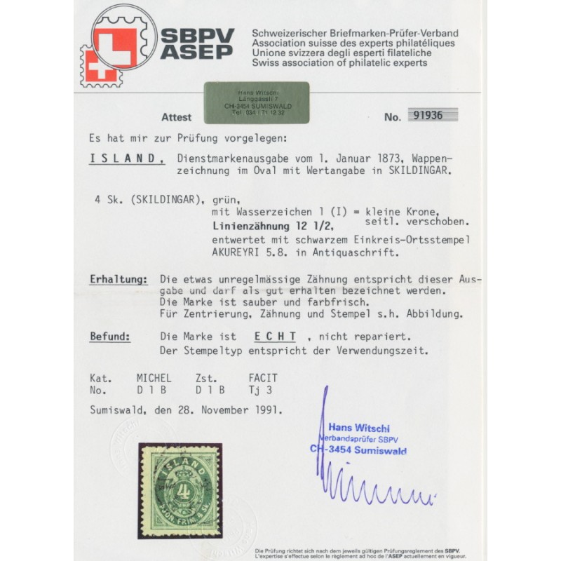 1873 4 Skilling green Numeral Official (Þjónustufrímerki), perf. 12½:12½, used – has an AKUREYRI postal cancel, no thins, tears or bends. Excellent perforations for this issue. Has a Witschi photo-certificate.