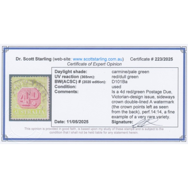 1921 4d carmine/pale green Postage Due, sideways double-lined A crown watermark, perf. 14:14, used – no thins, tears or bends. Has a Starling certificate.