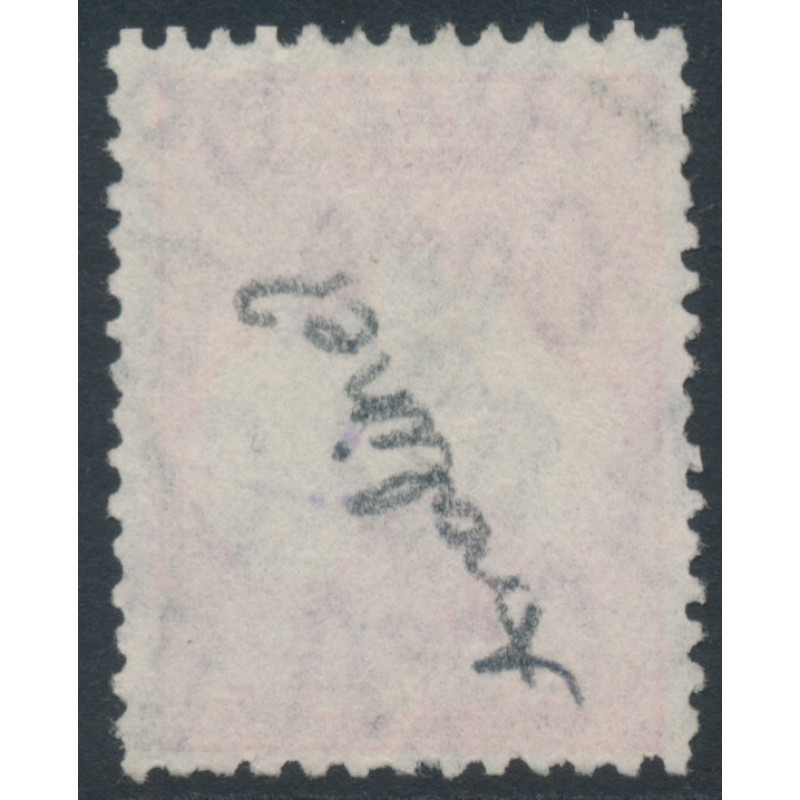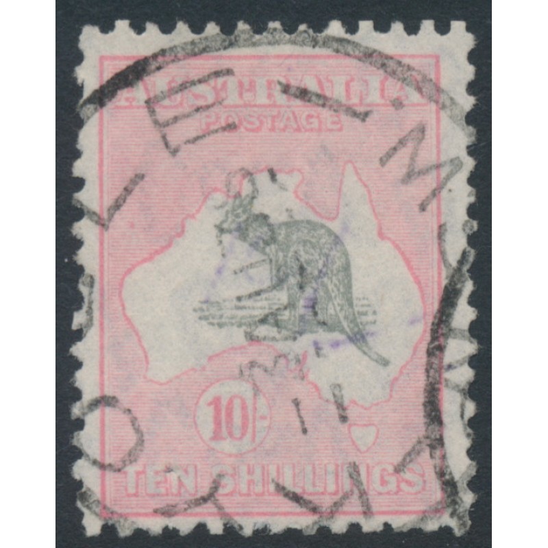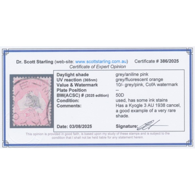 1932 10/- grey/aniline pink Kangaroo, CofA watermark, used – has a few ink stains from use on a parcel, otherwise sound. Has a Starling certificate.