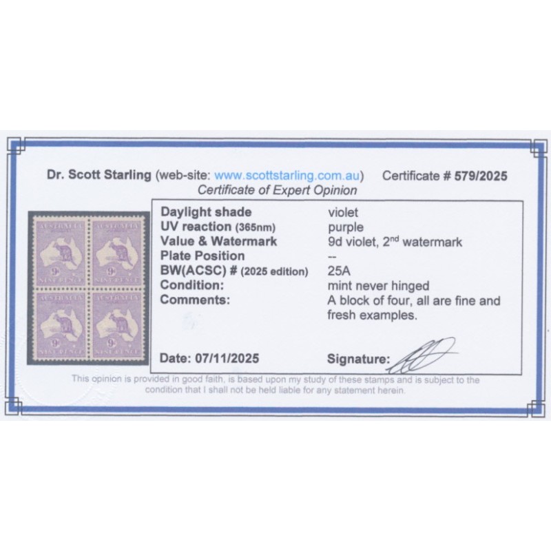1915 9d violet Kangaroo, 2nd watermark, mint never hinged – no thins, tears or bends. Has a Starling certificate.