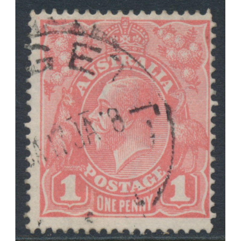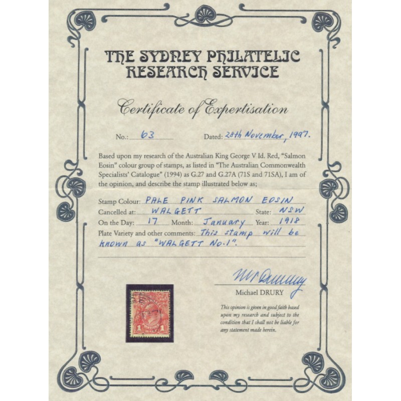 AUSTRALIA 1917 1d pale pink salmon eosin KGV Head (shade = G27A), used – no thins, tears or bends. Has a Drury and a Starling certificate. BW(ACSC) Cat. # 71SA