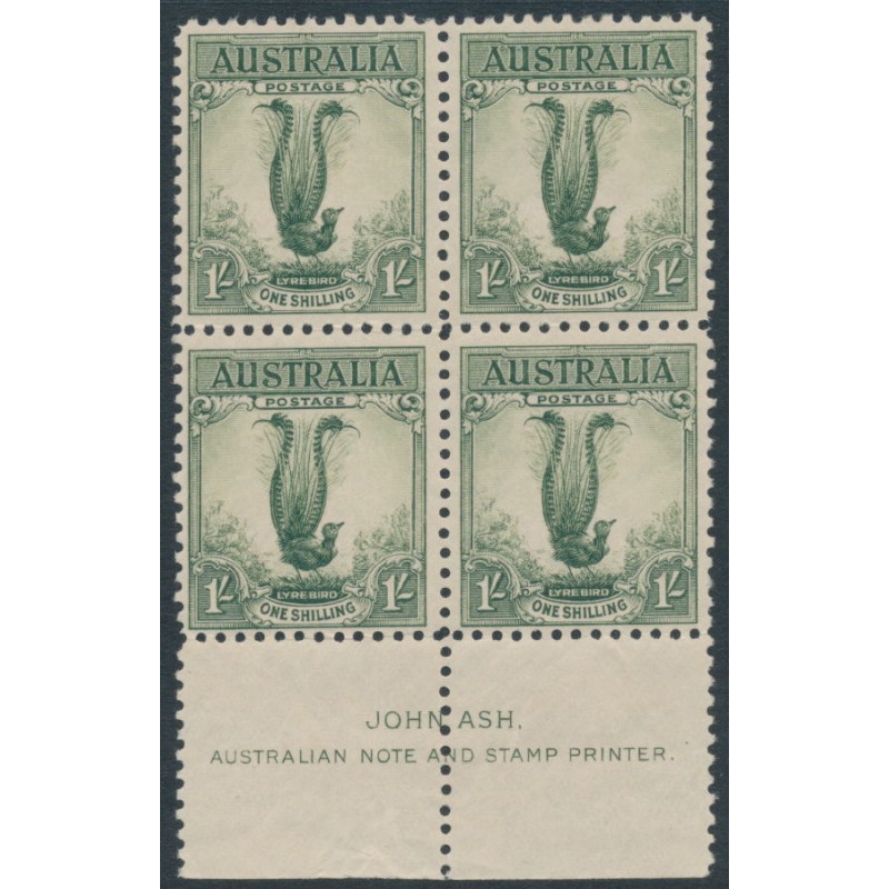 1931 1/- yellow-green Lyrebird (vertical mesh paper, picture measures 21½mm x 25¼mm), John Ash imprint block of 4, mint hinged – no thins, tears or bends.