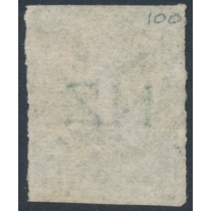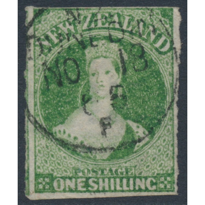 NEW ZEALAND / N.Z. / NZ 1864 1/- green Queen Victoria Chalon, imperforate, NZ watermark, used – no thins, tears or bends. SG Cat. # 100 CP Cat. # A6h(1)