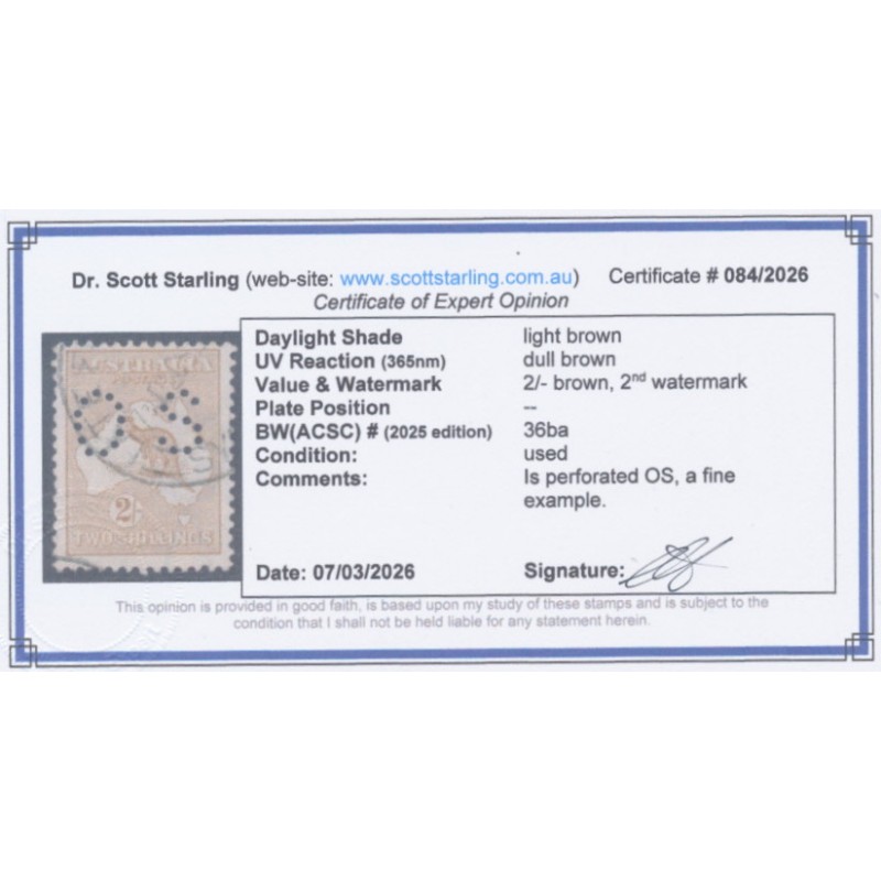 1915 2/- light brown Kangaroo, 2nd watermark, perforated OS, used – no thins, tears or bends. Has a Starling certificate.