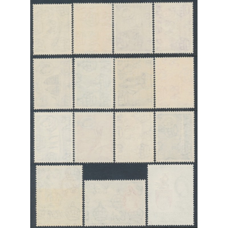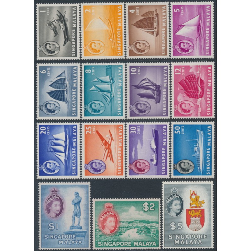 SINGAPORE 1955-1959 1c to $5 Queen Elizabeth II Definitives set of 15, mint never hinged – no thins, tears or bends. SG Cat. # 38-52