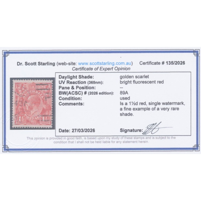 1924 1½d golden scarlet KGV Head, single watermark, used – no thins, tears or bends. Has a Starling certificate.