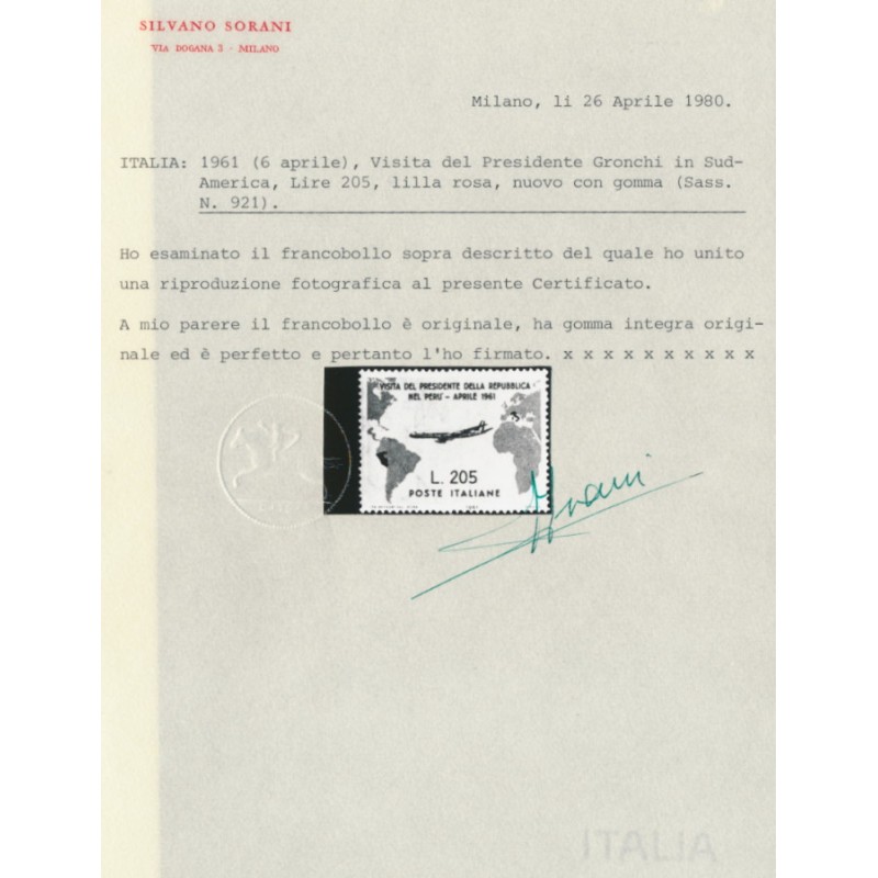 1961 205L pink Visit of President Gronchi to Peru, withdrawn issue due to the map of Peru being wrong (Gronchi Rosa), mint never hinged – no thins, tears or bends. Has a Sorani photo-certificate.
