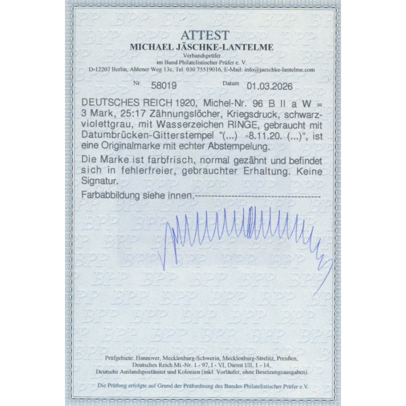 1920 3Mk grey-violet Kaiser Wilhelm Memorial, with rings watermark, used – no thins, tears or bends. Has a Jäschke-Lantelme BPP photo-certificate which states that the stamp is genuine and fault free. A nice example of a very rare watermark variety.